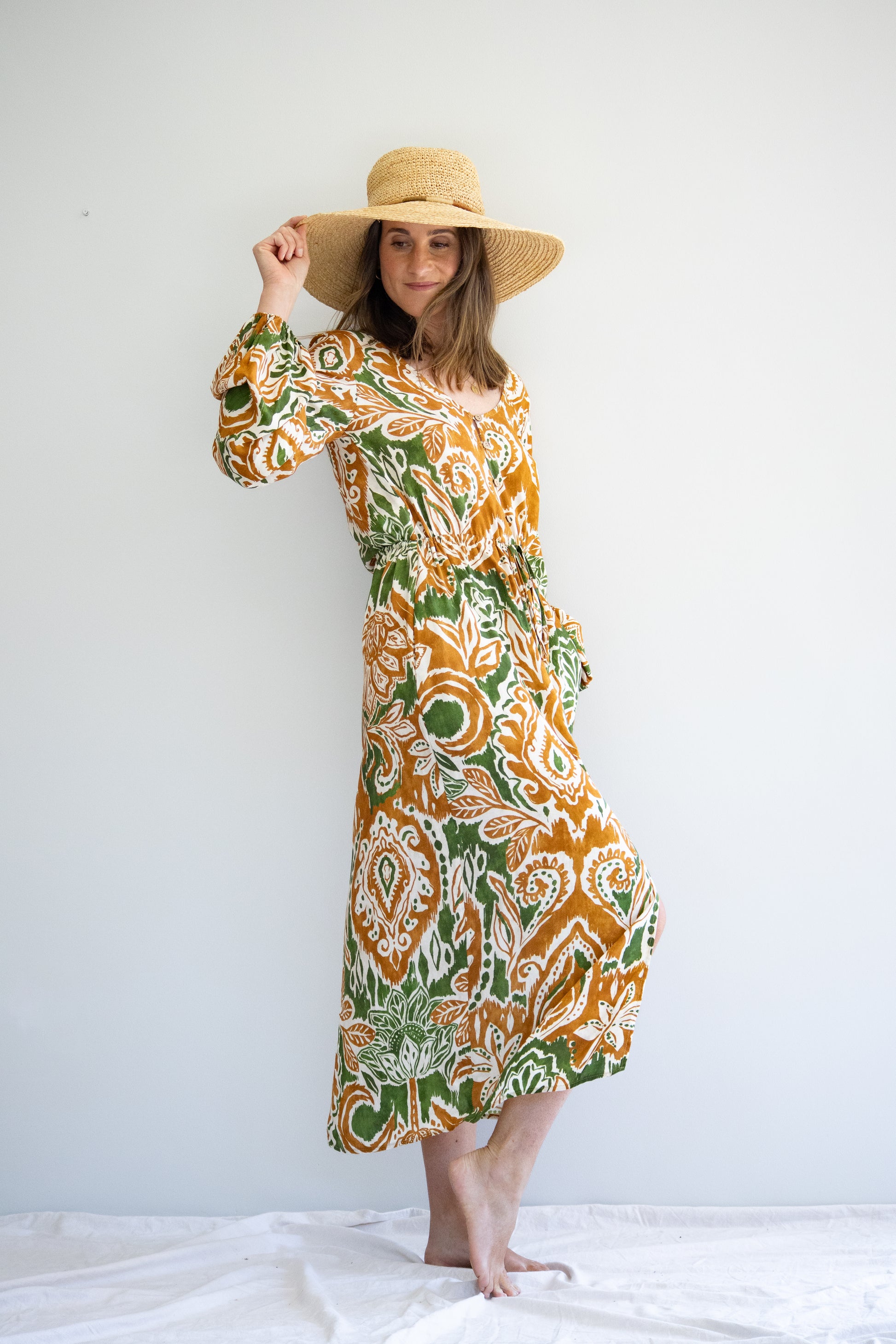 The Acacia Bloom Maxi Dress is a soft, flowy celebration of colour, ease and feminine grace. Crafted from our Wildflower fabric, this piece brings warm earthy browns and deep botanical greens together in an expressive, nature-inspired print.