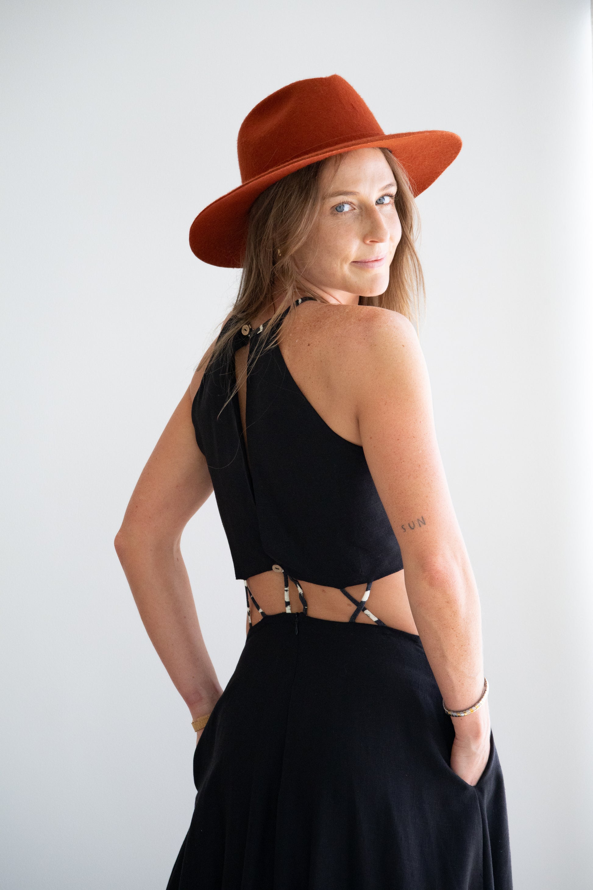This maxi dress features an open mid-riff, adding a touch of allure while keeping the silhouette elegant and balanced. The high neckline offers refinement, while the delicate centre slit along the upper back brings gentle movement and shape. Coconut shell buttons trail down the back, adding a natural, handcrafted finish that reflects Sunsara’s roots. The dress flows into a swinging, flared bottom hem that moves beautifully with every step. And yes — it has pockets, because practicality always matters.