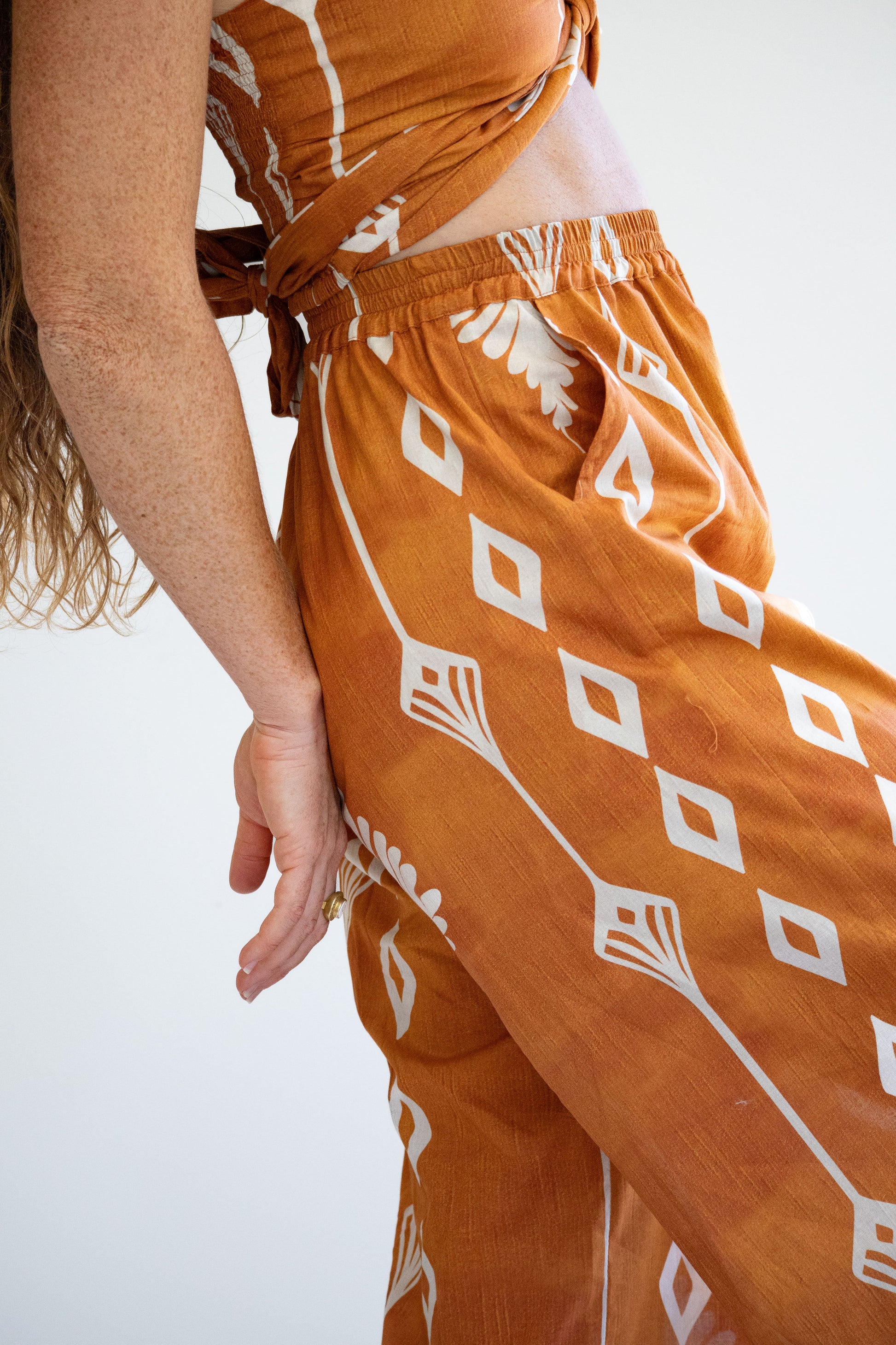 Pair them with the Ember Top in Terracotta Fans for a full matching set, or style them with any Khaki Green Sunsara linen top for an earthy, balanced look.