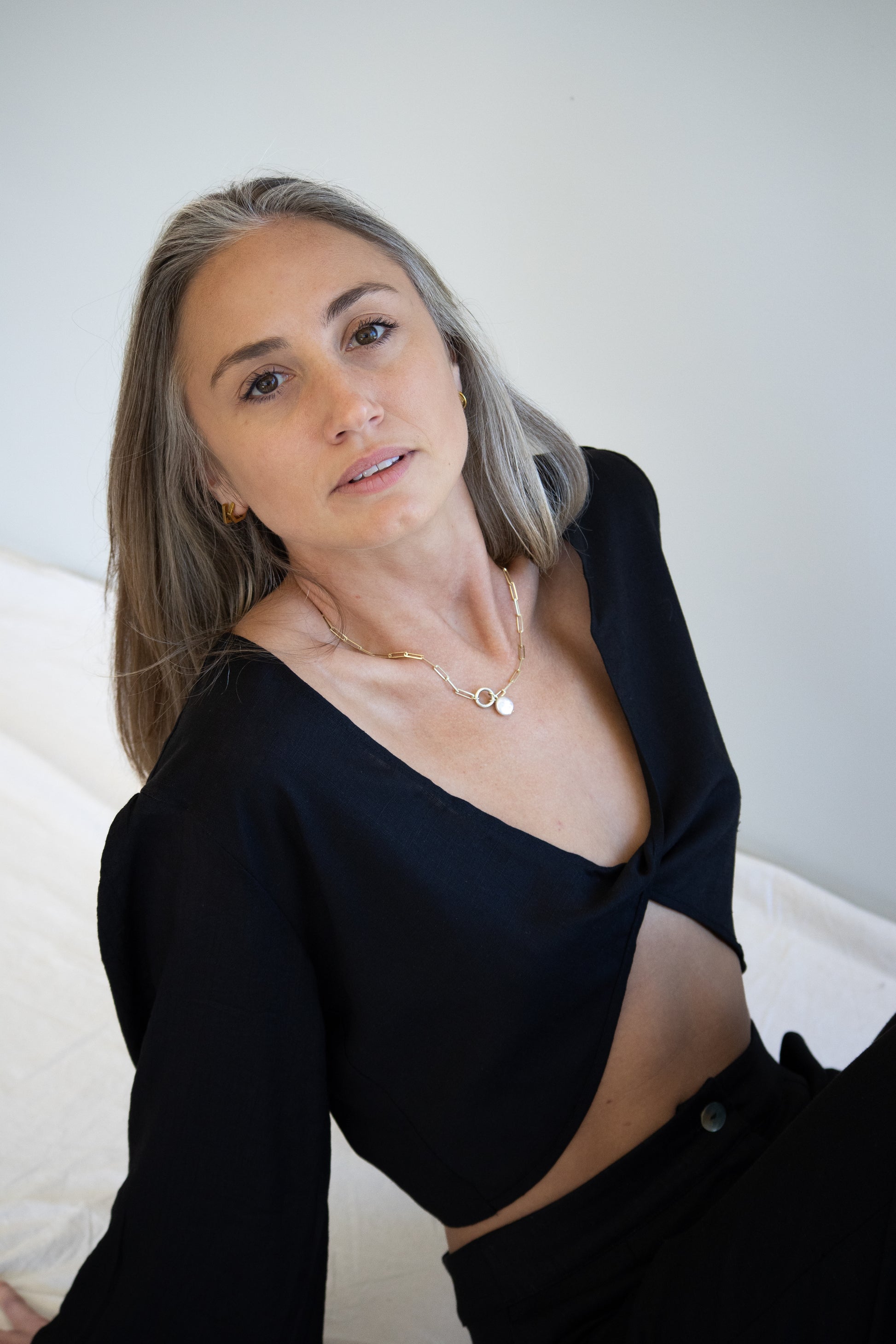 Step into quiet allure with the Twilight Twist Crop Top, a sensual blend of structure and softness. The bodice is crafted from Black Charcoal linen, twisting effortlessly at the front to create an elegant, sculpted silhouette and a subtle mid-riff reveal — confident, feminine and beautifully expressive.